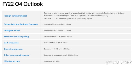 在财报会议中,Amy Hood给出了微软2022财年第四季度的业绩指引。