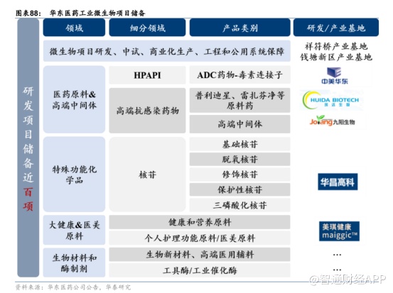 2021年,华东医药工业微生物板块合计实现收入4.18亿元,同比增长69.2%。2022年第一季度,工业微生物板块发展势头持续向好,外部订单需求继续保持较快增长,推动报告期营业收入同比增长99%。截至2021年,公司工业微生物领域研发项目共有总项目45项,包括特殊功能化学品7项,医药原料药和高端中间体23项,大健康和医美原料12项,生物材料3项;其中,特殊功能化学品有5项为系列项目,共有50余个子项目;医药原料药和高端中间体有2项系列项目,共含近10个子项目;所有项目累计已超100项