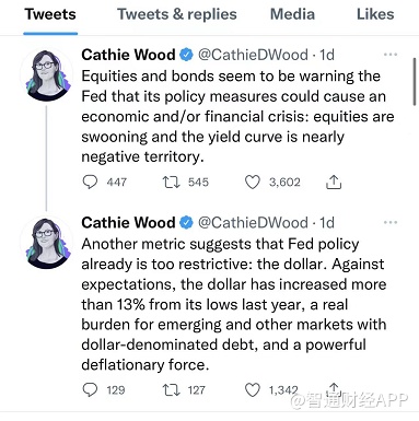 伍德昨日在社交媒体上表示:“股票和债券似乎在警告美联储,其政策措施可能会导致经济和/或金融危机:股票正在下跌,收益率曲线几乎处于负值区域。”