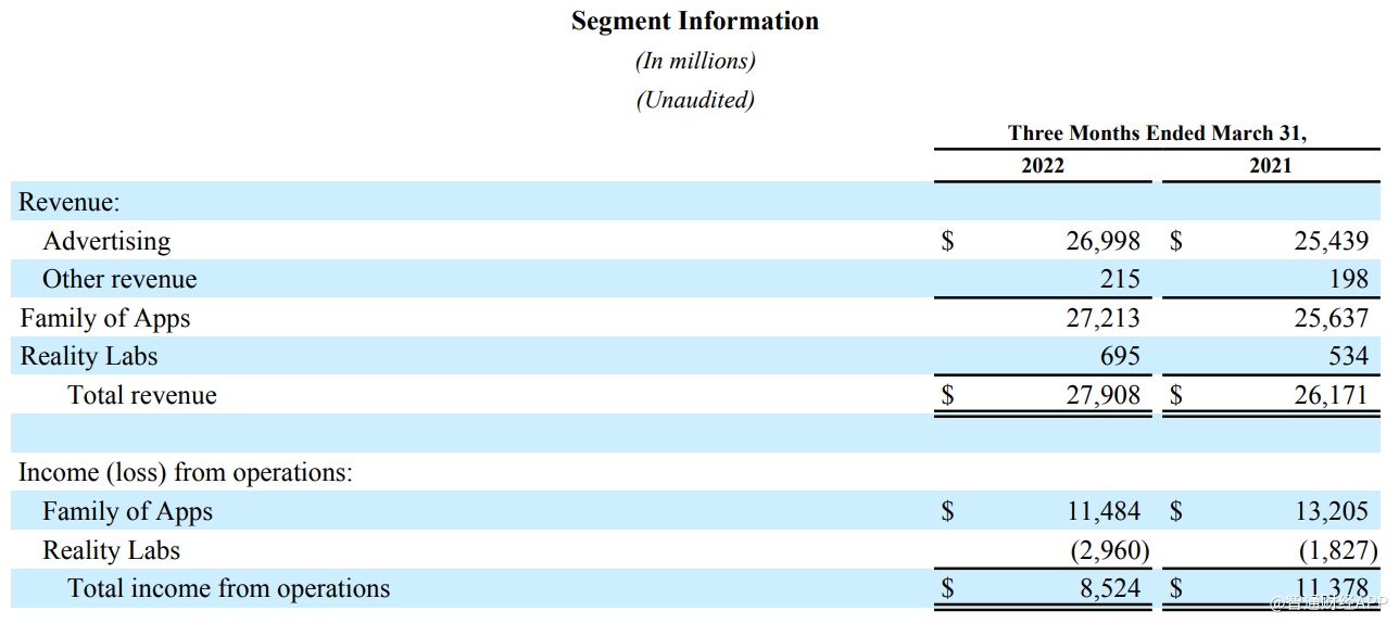 公司一季度营收279.08亿美元,市场预期282亿美元。一季度包括Facebook、Instagram、Messenger、WhatsApp在内的应用家族(Family of Apps)收入272.1亿美元,分析师预期275.2亿美元;其中广告收入为269.98亿美元,分析师预期274.8亿美元,其他收入为2.15亿美元;应用家族营业利润114.8亿美元。现实研究室收入6.95亿美元,分析师预期6.771亿美元;现实研究室营业亏损29.6亿美元。