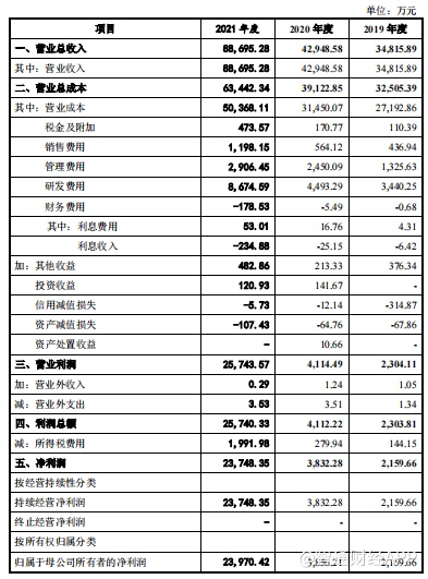 2019-2021年,必易微营业收入分别为34815.89万元、42948.58万元和88695.28万元,营业收入的同比增长率分别为35.64%、23.36%和106.52%;归属于母公司所有者的净利润分别为2159.66万元、3856.21万元和23970.42万元,呈现出较快的增长趋势。