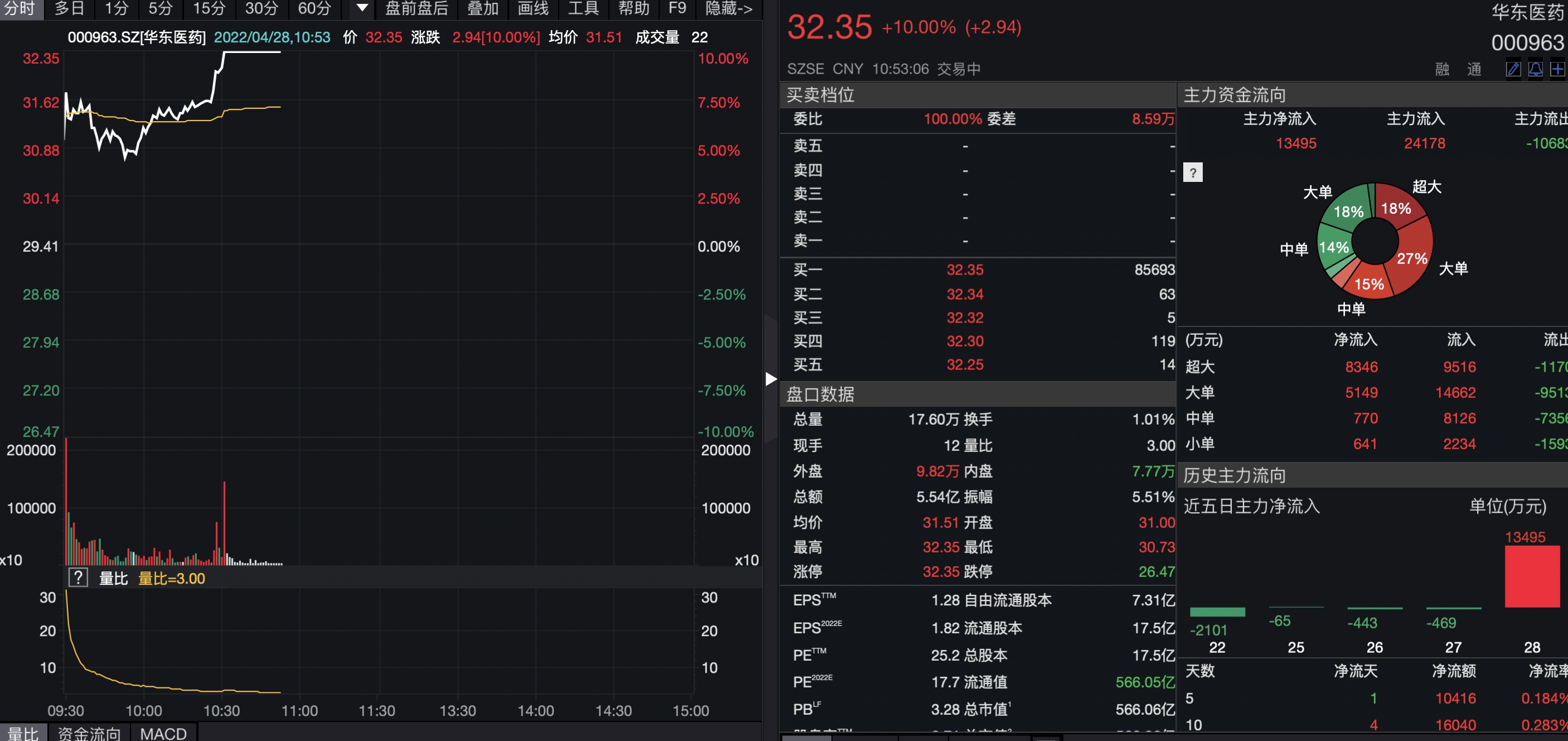 智通财经APP获悉,2022年4月28日,华东医药(000963.SZ)早盘10万手封死涨停,报32.35元/股。
