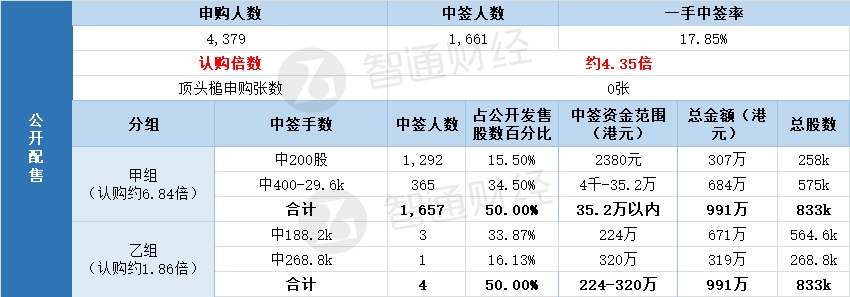 其中,公开配售申购人数4379人,一手中签率17.85%,认购倍数约4.35倍。