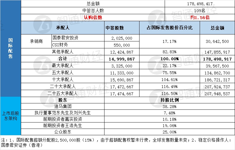 国际配售申购人数未披露,认购倍数约1.56倍。