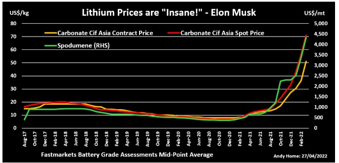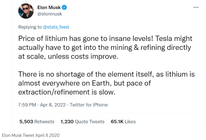 据智通财经APP了解,特斯拉(TSLA.US)首席执行官马斯克曾在推特上表示,如果“疯狂”的锂价持续下去,该公司“可能不得不直接大规模地进入采矿和精炼行业”。