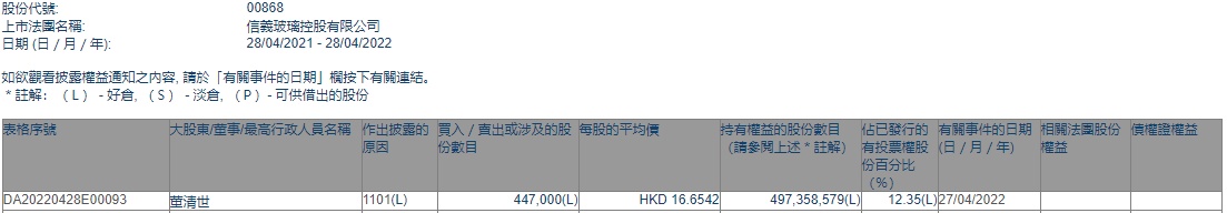 智通财经APP获悉,香港联交所最新资料显示,4月27日,执行董事董清世增持信义玻璃(00868)44.7万股,每股作价16.6542港元,总金额为744.44万港元。增持后最新持股数目约为4.97亿股,最新持股比例为12.35%。
