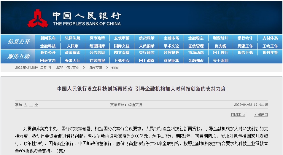 智通财经APP获悉,4月28日,中国人民银行官网发布新闻称,人民银行设立科技创新再贷款,引导金融机构加大对科技创新的支持力度,撬动社会资金促进科技创新。科技创新再贷款额度为2000亿元,利率1.75%,期限1年,可展期两次,发放对象包括国家开发银行、政策性银行、国有商业银行、中国邮政储蓄银行、股份制商业银行等共21家金融机构,按照金融机构发放符合要求的科技企业贷款本金60%提供资金支持。