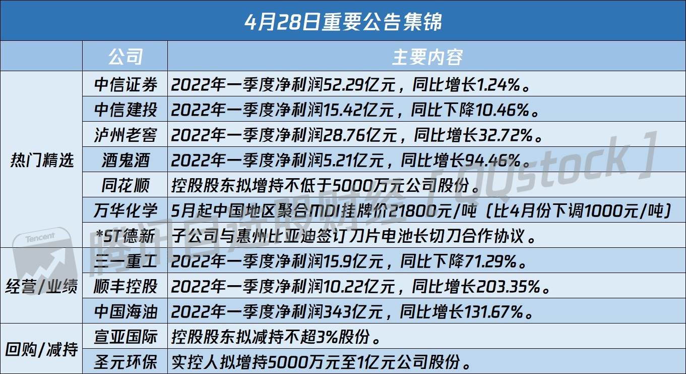 泸州老窖:一季度净利润28.76亿元,同比增长32.72%。同日披露年报,2021年实现净利润79.56亿元,同比增长32.47%,拟10派32.44元。