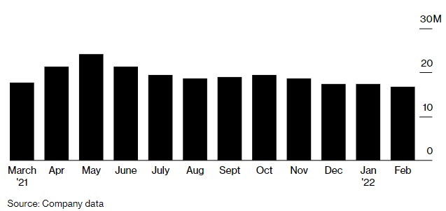 数据显示,Robinhood股价走势自去年上市以来暴跌74%,几近崩盘。该公司营收的主要来源,即交易活动量持续下降。散户投资者在股市的参与度开始下降,这对Robinhood和其他券商来说是一个新的难题。据彭博情报分析师Jackson Gutenplan和Larry Tabb估计,3月初美国股市约17%的成交量来自散户投资者,低于去年第一季度创下的24%峰值。