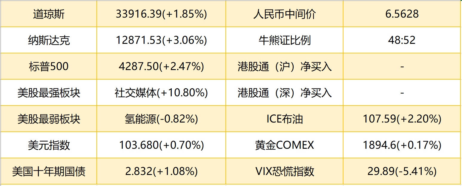 1.隔夜美股截至收盘,道指涨614.46点,涨幅为1.85%,报33916.39点;纳指涨382.59点,涨幅为3.06%,报12871.53点;标普500指数涨103.54点,涨幅为2.47%,报4287.50点。社交媒体、宅经济、半导体板块及科技股均表现强势。港股ADR指数下跌,按比例计算,收报20213点,较香港收市跌62.66点或0.31%。