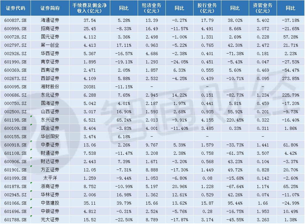 南京、光大、方正多家券商经纪业务成拖累,西部、东北资管业务大幅上升