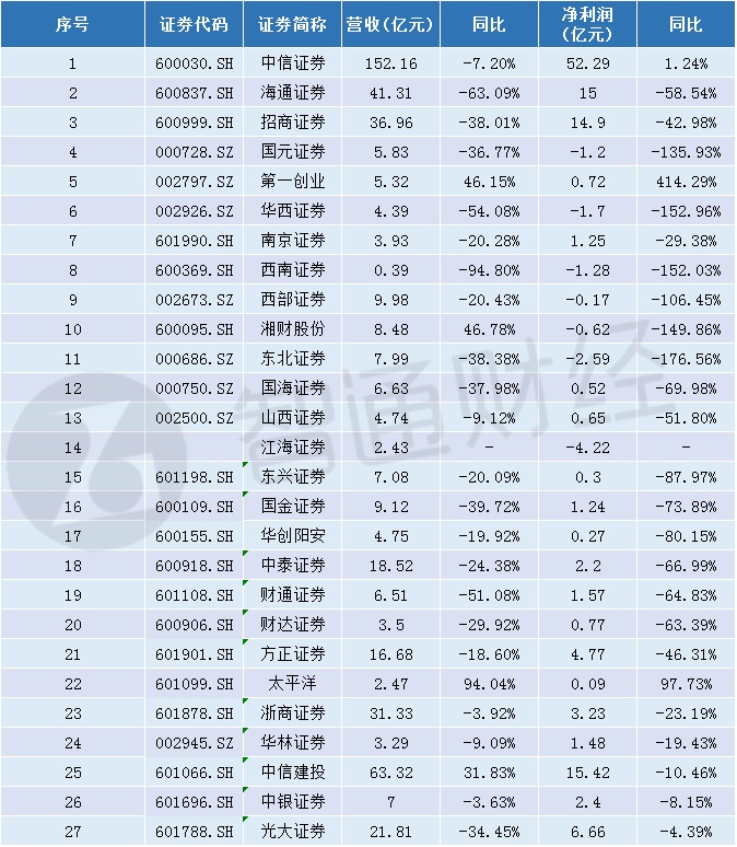 虽无新增亏损券商,但大部分券商营收和归母净利润遭重创。其中,包括海通证券、招商证券、国金证券在内的10家券商营收退坡幅度超30%,有15家券商归母净利润下滑超50%。