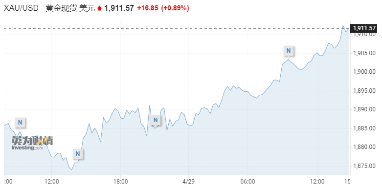 截至发稿,现货黄金日内涨0.89%,报每盎司1911.57美元,但本月迄今已累计下跌约2%。黄金期货涨1.07%,报1911.45美元。其他贵金属方面,现货白银上涨1.29%至每盎司23.455美元,铂金上涨1.34%至931.66美元,钯金上涨1.17%至2258.05美元。