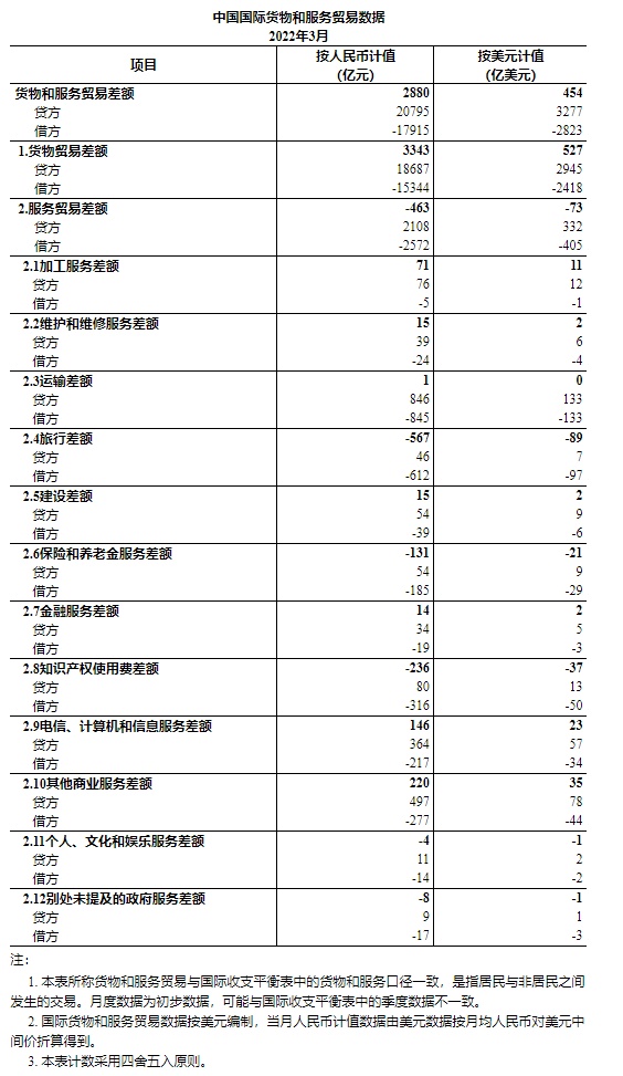 按美元计值,2022年3月,我国国际货物和服务贸易出口3277亿美元,进口2823亿美元,顺差454亿美元。