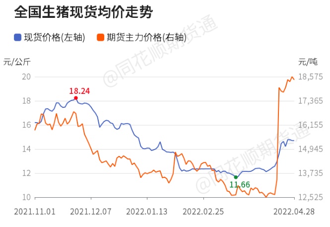 进入四月份,生猪期货连续大涨。4月18日以来,短短10个交易日,生猪期货指数暴涨近20%。截至4月29日收盘,报18337元/吨,涨势犀利。如果从去年9月的最低点13485元/吨算起,一年时间不到,生猪期货涨了35%。