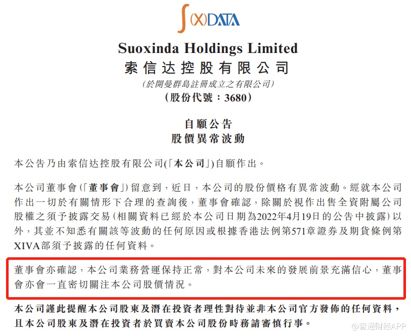 同时,索信达控股管理层还表示,公司目前营运保持正常,核心业务发展强劲,对未来前景充满信心。