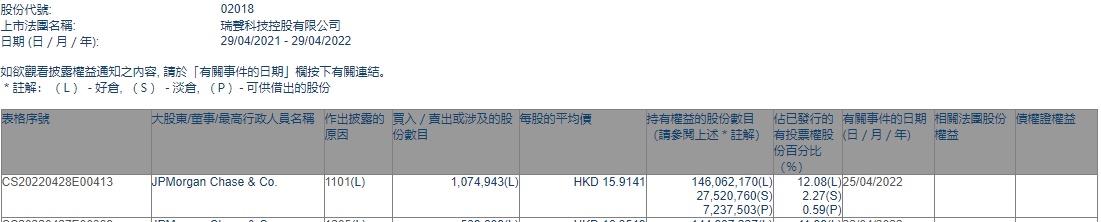 智通财经APP获悉,香港联交所最新资料显示,4月25日,小摩增持瑞声科技(02018)107.4943万股,每股作价15.9141港元,总金额约为1710.68万港元。增持后最新持股数目约为1.46亿股,最新持股比例为12.08%。