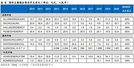 根据IEA数据,2021年全球煤炭总产量为78.9亿吨,同比上升5%,但仍未恢复至2019年的生产水平。更为关键的是,观察海外主要煤企近10年的资本开支情况,整体亦明显处于收缩进程中。