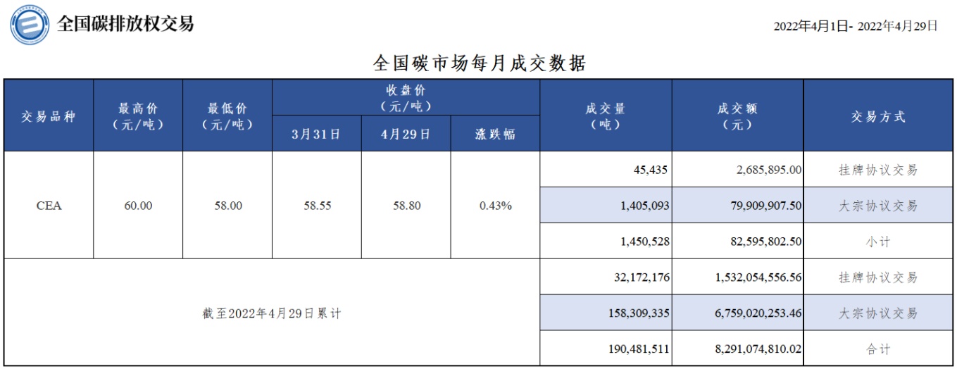 智通财经APP获悉,4月29日,上海环境能源交易所发布全国碳市场4月份成交数据。数据显示,4月全国碳市场碳排放配额(CEA)总成交量约为145万吨,总成交额约为8259.6万元。截至4月29日,全国碳市场碳排放配额(CEA)累计成交量约为1.9亿吨,累计成交额约为83亿元。