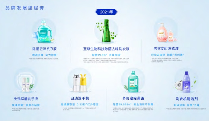 2021年,蓝月亮围绕消费者不断变化的清洁需求,持续在衣物清洁护理、个人清洁护理及家居清洁护理三大产品体系中推陈出新,不断完善全套家庭清洁解决方案,传递的全新洁净生活方式。