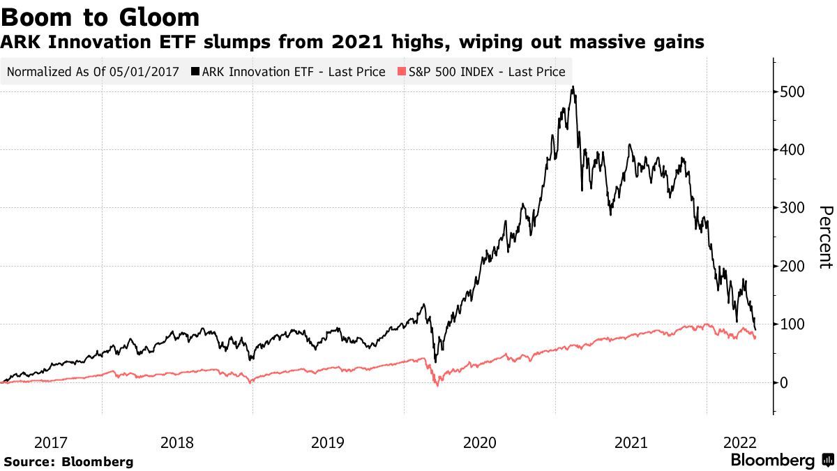此外,该基金相对于标普500指数的突出表现几乎消失殆尽。虽然ARK Innovation ETF过去五年来的回报率约为109%,而标普500指数回报率为97%,但这与去年年底前的近四倍回报率相比相差甚远。