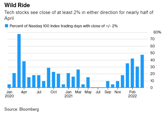 根据彭博社汇编的数据显示,本月约47%的交易日中,以科技股为主的纳指涨跌幅度至少达到2%,这是自2020年3月以来的最高水平。