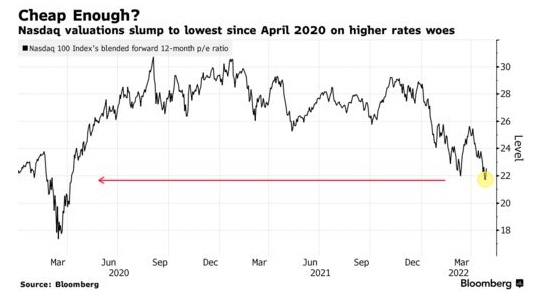 4月,纳指一度被大量抛售,使得该指数的12个月远期市盈率在上周降至不到两年来最低水平的22倍。曾在3月中旬,该指数在经历了为期两周的强劲反弹后,也一度跌破该水平。