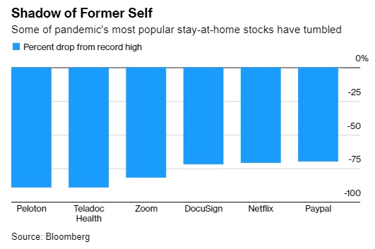 除此之外,可能影响该行业的一类公司也尚未公布财报:享尽疫情红利的科技公司。目前,许多居家概念股股价已经从疫情推动的高点下跌。自疫情限制解除以来,Zoom(ZM.US)、DocuSign Inc.(DOCU.US)和Peloton(PTON.US)已经成为了最大的输家,但这些公司目前还没公布财报。