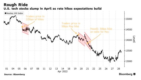 智通财经APP了解到,由于投资者担忧经济放缓,以及对美联储加息预期越来越强烈,纳斯达克100指数今年以来遭受重创,仅在4月份就蒸发了1.8万亿美元市值。