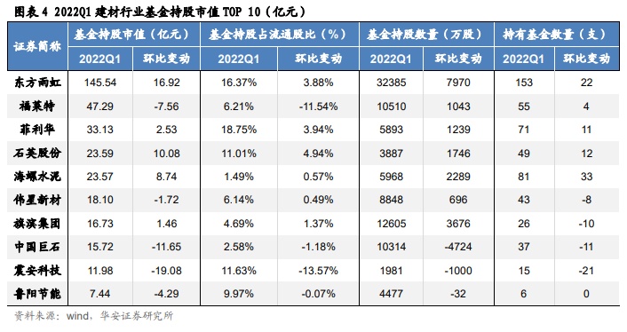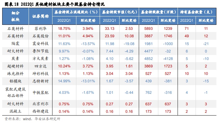 2022Q1 其他建材板块基金持股市值合计为 90.33 亿元,环比 2021Q4 下 降 14.53%;基金配置比例为 0.40%,超配比例为 0.12%。以基金持股市值 规模计,基金持仓最多的细分板块依次是石英材料(菲利华 33.13 亿元、 石英股份 23.59 亿元)、建筑减隔震(震安科技 11.98 亿元)、耐火材料(鲁 阳节能 7.44 亿元)。