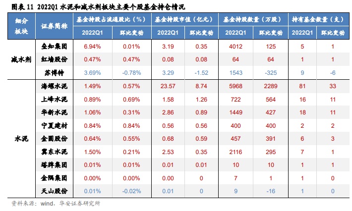 从持股市值角度来看,2022Q1华东、华中/西南、华北水泥龙头和减水剂两大头部企业位居板块持仓市值前五名,分别为海螺水泥(23.57亿元)、苏博特(3.29亿元)、垒知集团(3.19亿元)、华新水泥(2.86亿元)、冀东水泥(2.53亿元)。