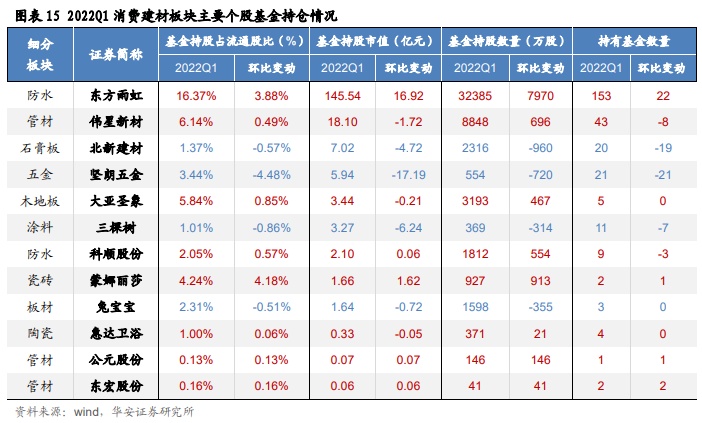 以基金持股占流通股比计,2022Q1消费建材板块中获机构增持较多的个股为东方雨虹(+7970万股)、蒙娜丽莎(+913万股)、伟星新材(+696万股)、科顺股份(+554万股)、大亚圣象(+467万股)、公元股份(+146万股);减持幅度较大的个股为三棵树(-314万股)、兔宝宝(-355万股)、坚朗五金(-720万股)、北新建材(-960万股)。