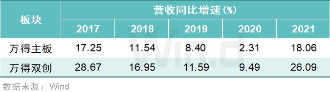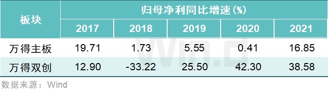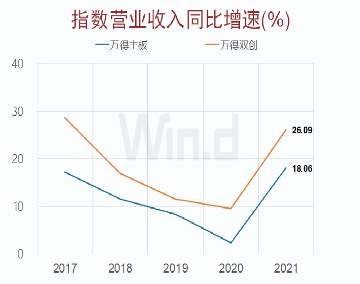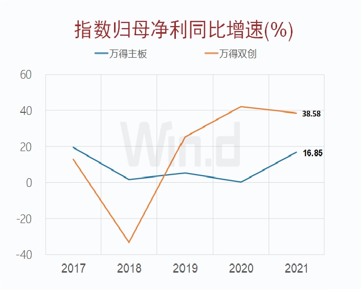 从万得主板和万得双创指数近两年趋势来看,自2020年跌至谷底后营收持续呈现高速增长态势,2021年分别达18.06%和26.09%。从盈利情况来看,主板去年增速明显,达16.85%,双创板块高达38.58%,不过较2020年盈利增速有所放缓。