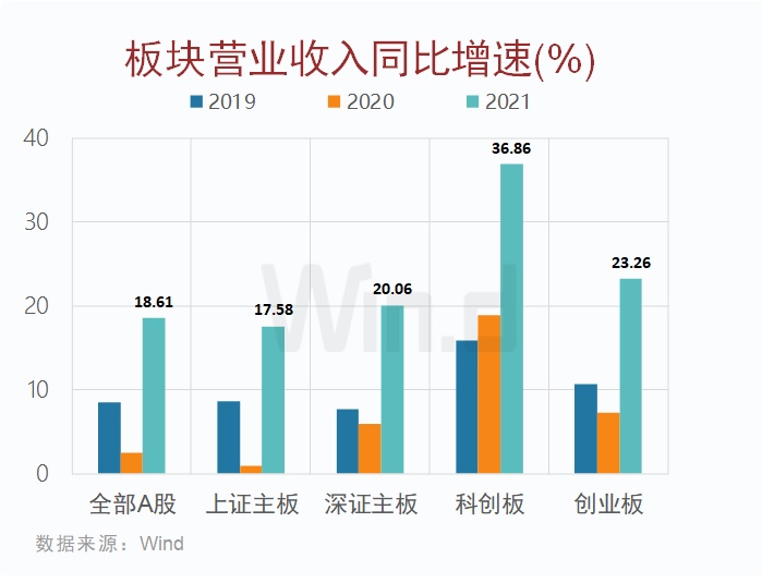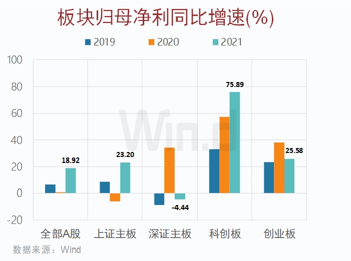 从板块来看,科创板和创业板较主板板块营收同比增速更高,分别为36.86%、23.26%、17.58%(上证主板)和20.06%(深证主板),盈利能力方面,科创板和创业板净利润同比增速为75.89%和25.58%,上证主板和深证主板同比增速分别为23.20%和-4.44%。