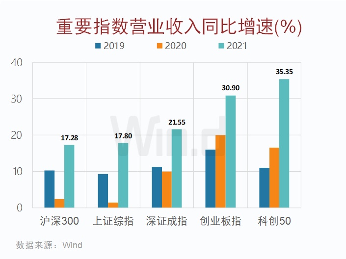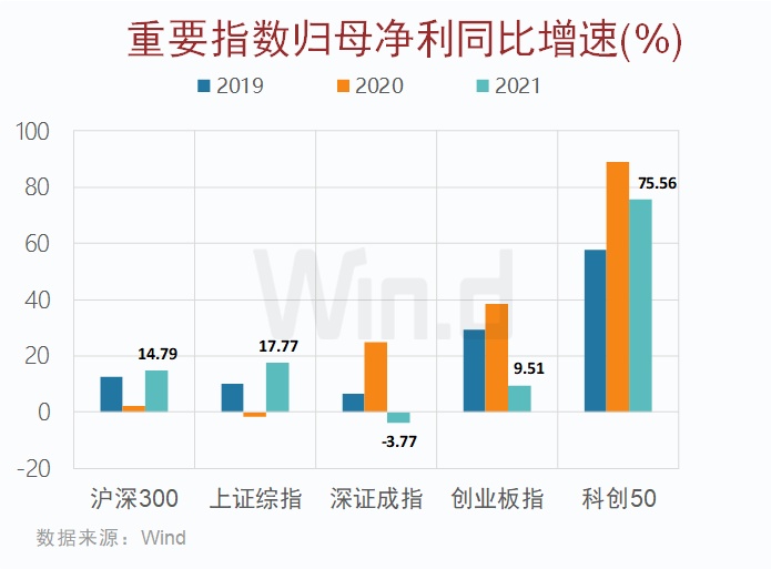 从重要指数来看,科技股的表现要显著优于大盘,科创50指数板块的营收增速和净利增速分别达35.35%和75.56%,而沪深300、上证综指、深证成指、创业板指的营收增速分别为17.28%、17.80%、21.55%和30.90%,净利增速分别为14.79%、17.77%、-3.77%和9.51%。从近三年趋势来看,各个板块营收增速同比提升都较大,剔除2020年低基数效应后,都远超2019年的同比增速。盈利增速除深证成指及创业板指表现不及2020年外,多个板块增速均有所提升,此外科创50板块增速略微放缓。