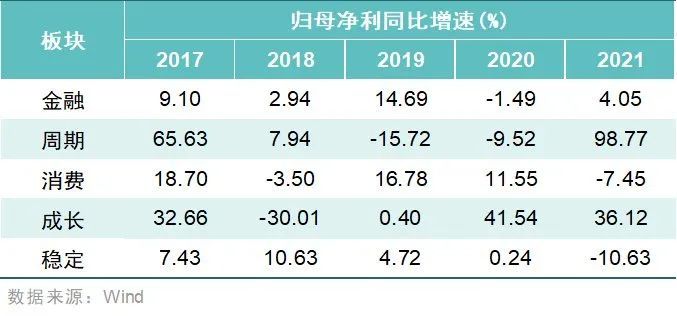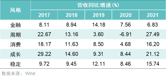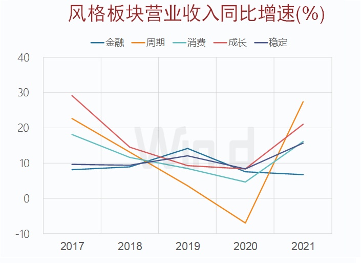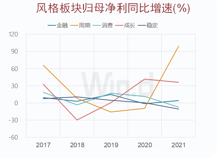 从行业风格来看,各个行业板块2021年营收增速表现尚可,其中周期和成长板块均在20%以上。净利增速上,周期板块高达98.77%,成长和金融板块分别为36.12%和4.05%,而消费和稳定复苏较缓,增速分别为-7.45%和-10.63%。