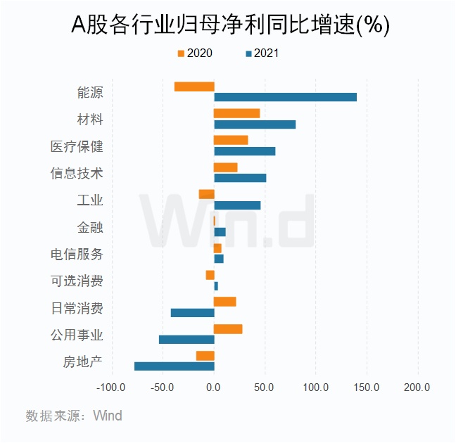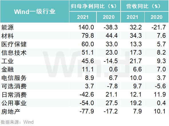 从行业来看,年报利润增速较高的行业为中上游行业,大宗商品价格走强,能源及材料的利润增速分别高达140%和80%。全球疫情反复,日常消费行业较为低迷,行业利润同比下降43%。