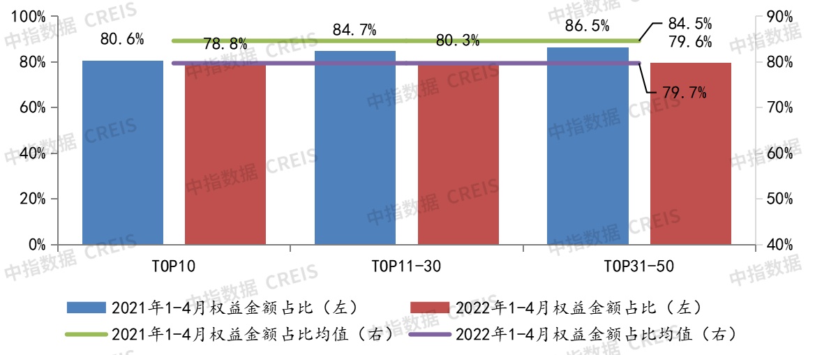 50家代表房企招拍挂拿地权益金额占比均值略有下降。2022年1-4月,50家代表房企招拍挂权益金额占比均值为79.7%,较同期下降4.9个百分点,企业倾向合作拿地。具体来看,与去年同期相比,TOP31-50阵营企业拿地权益金额占比降幅最大,下降6.9个百分点,TOP11-30阵营企业拿地权益金额占比下降4.4个百分点,TOP10阵营企业拿地权益金额占比上升了1.9个百分点。