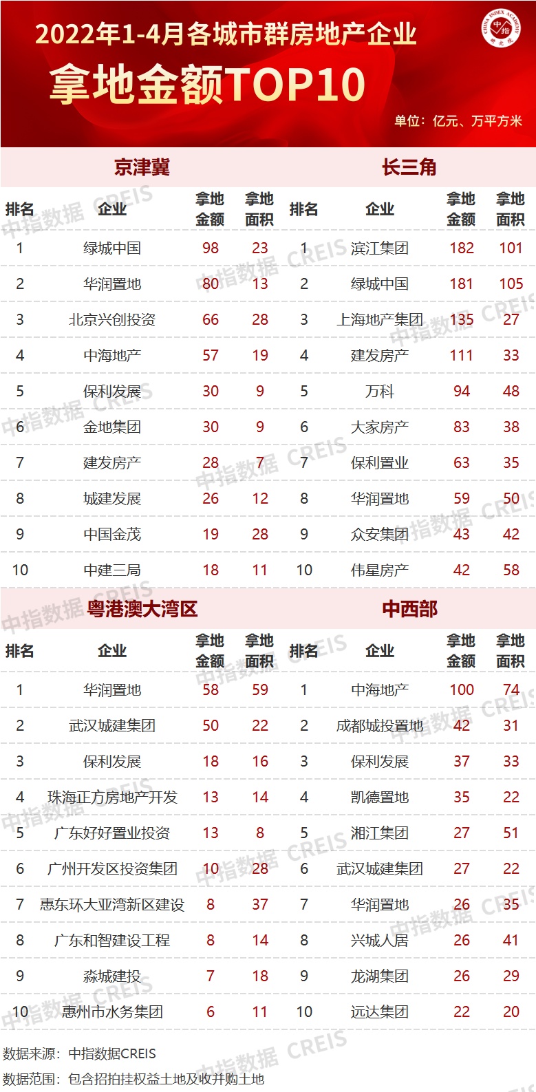 从各城市群拿地金额来看,长三角地区赶超京津冀领跑全国。4月,长三角TOP10企业拿地金额993亿元,居四大城市群之首,其中,滨江集团拿地金额为182亿元;京津冀TOP10企业拿地金额452亿元,位列第二;中西部TOP10企业拿地金额368亿元,位列第三。拿地面积来看,长三角TOP10企业拿地面积以537万平方米位居四区域首位,继续领跑。
