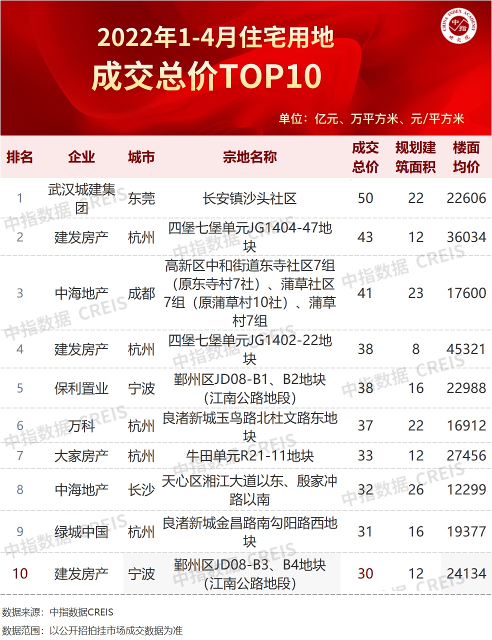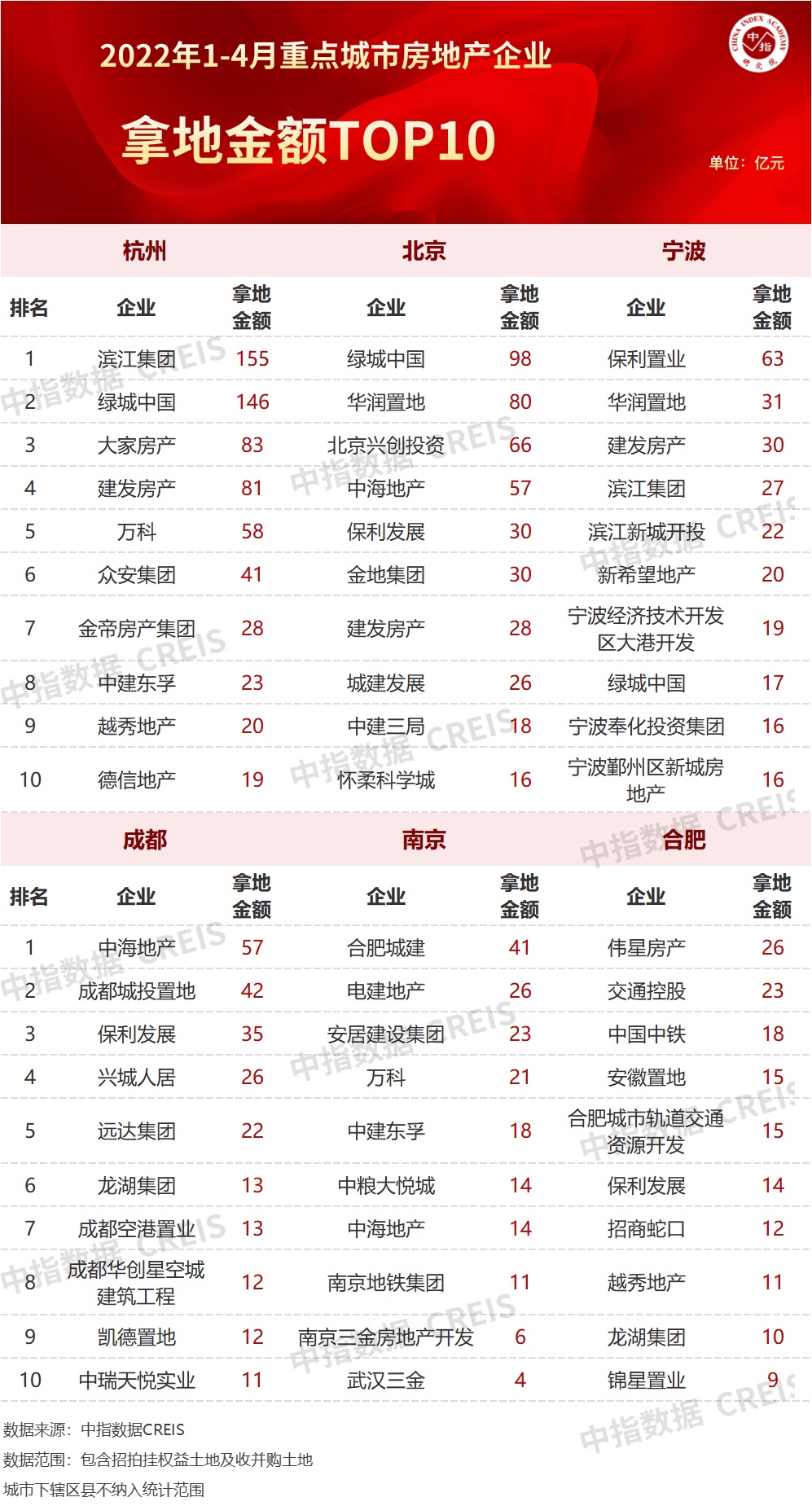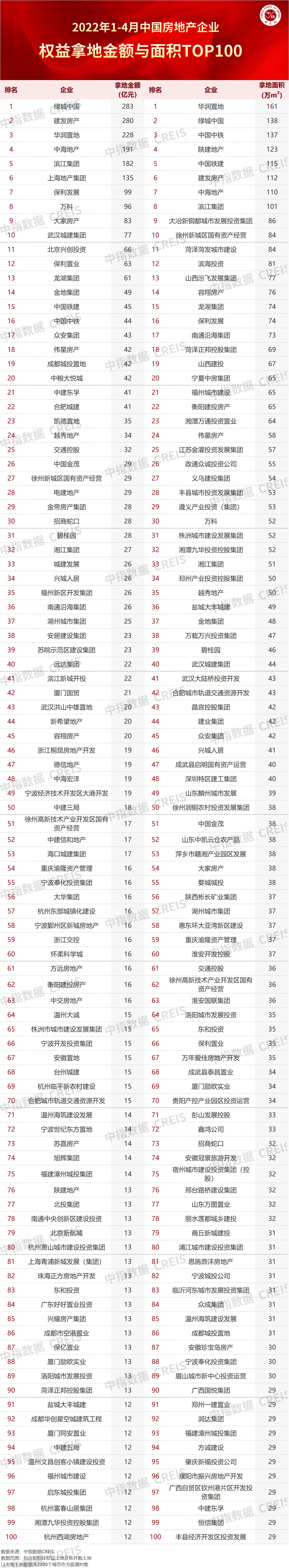 2022年1-4月,TOP100企业拿地总额3626亿元,拿地规模同比下降55.9%。TOP100门槛值为12亿元,较2021年4月下降10亿元,TOP100企业招拍挂权益拿地总额占全国300城土地出让金的比例为51.5%。