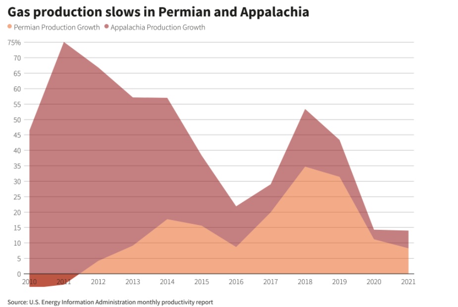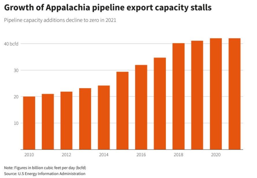 阿巴拉契亚地区的增长量已经放缓,在2021年,阿巴拉契亚地区的天然气供应约占美国的37%。增长放缓的主要原因是能源企业越来越难以建造新的天然气管道将天然气输送至美国宾夕法尼亚州、俄亥俄州和西弗吉尼亚州。在过去10年间的大部分时间里,阿巴拉契亚一直是美国天然气产量的主要地区,天然气产量从2010年到2019年平均每年增长36%。