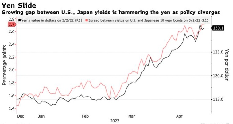 由于政策分化,美国和日本国债收益率差距不断扩大,对日元构成了打击。市场臆测日本政府可能考虑干预市场以支撑日元,智通财经上周报道,美元兑日元突破130日元的关键心理关口。在此之前,日本央行加大力度捍卫其宽松的货币政策。