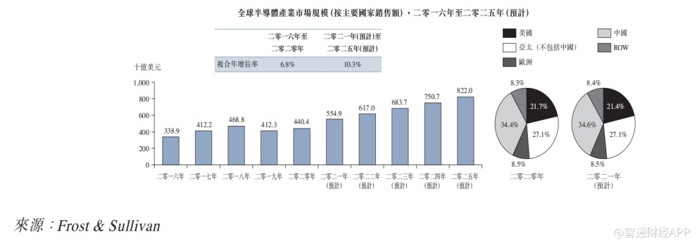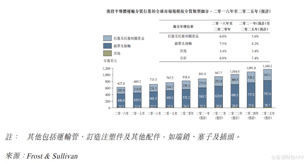 据悉,后段半导体运输介质行业的发展主要受全球半导体产业市场规模驱动。据弗若斯特沙利文数据,区域经济的增长及领先的技术进步使半导体行业的市场规模自2016年的约3,389亿美元增加至2020年的约4,404亿美元,复合年增长率为6.8%。