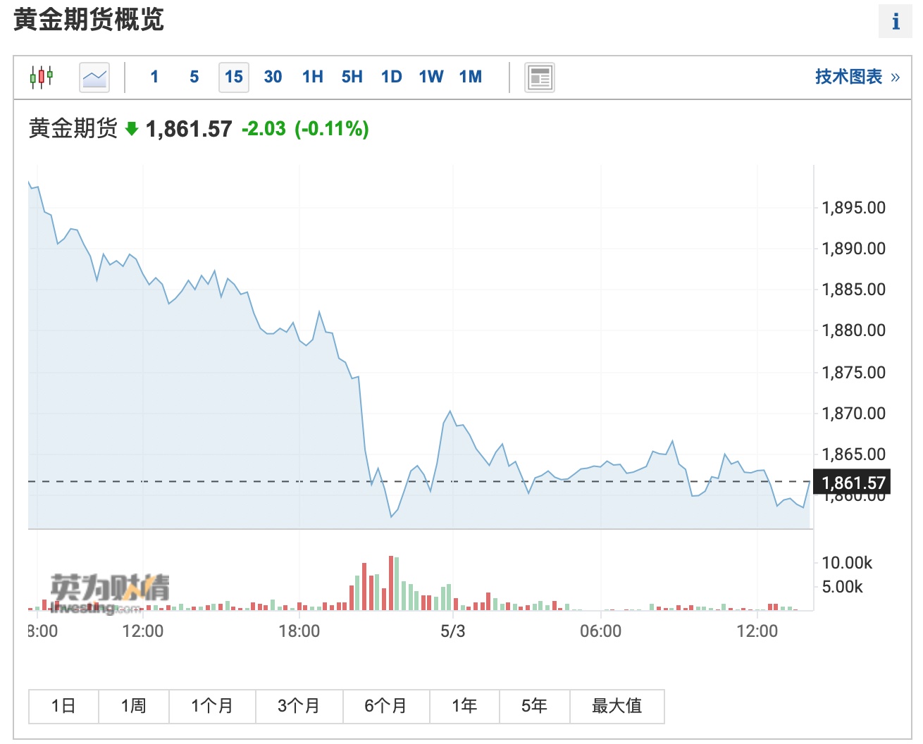 周一,COMEX 6月黄金期货跌2.52%,收于每盎司1863.6美元。截至发稿,黄金期货价格再跌0.11%,报1861.57美元/盎司。