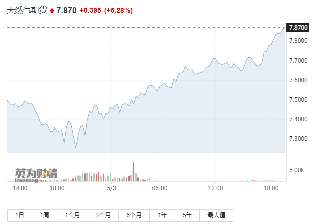 智通财经APP获悉,5月3日晚间,美国天然气期货短线拉升涨5.28%,现报7.87美元/百万英热。据报道,意大利总理德拉吉表示就是否使用卢布结算俄罗斯天然气的问题,将按照欧盟委员会的要求,和其他欧盟成员国步调一致。欧盟委员会就“卢布结算是否构成规避制裁”发表明确意见非常重要。据悉,目前意大利大约40%的天然气进口依赖于俄罗斯。