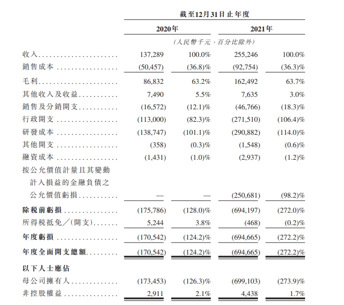 于2020及2021年,公司收入分别约为1.37亿元及2.55亿元人民币,同期,毛利约为8683.2万及1.62亿元人民币。