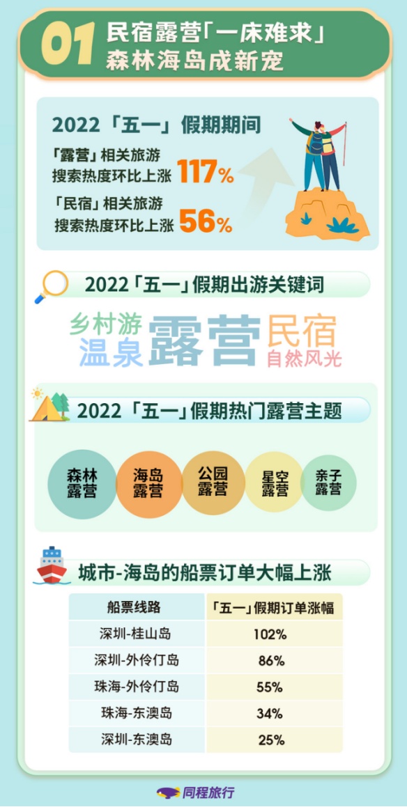 2022年“五一”假期,由于国内部分地区疫情反复,中国旅游出行市场呈现出全新发展趋势。5月4日,同程旅行发布《2022“五一”假期旅行消费数据报告》,显示,露营和民宿市场在假期持续升温。