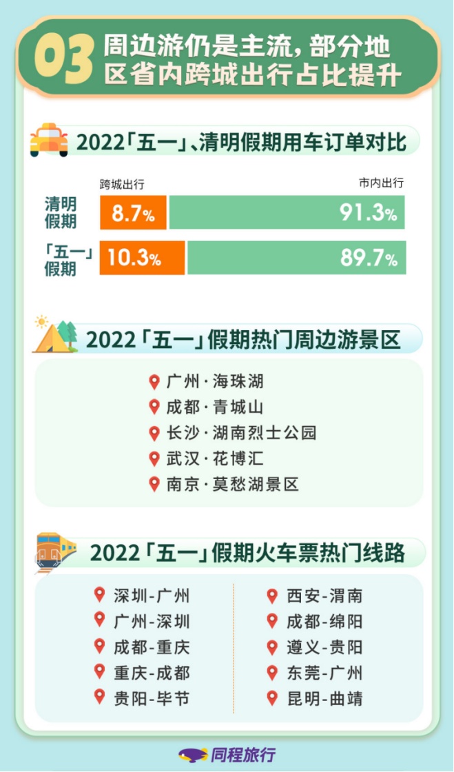 同程研究院负责人介绍,虽然疫情给人们的旅游出行信心造成暂时影响,部分地区更是对学生等群体的出行做了限制性规定,但假期出游仍是很多家庭的必选项。城市周边的景区和公园也因此成为人们的最佳选择。同程旅行数据显示,“五一”假期热门周边游景区分别为广州的海珠湖、成都的青城山、长沙的湖南烈士公园、武汉的花博汇和南京的莫愁湖景区。