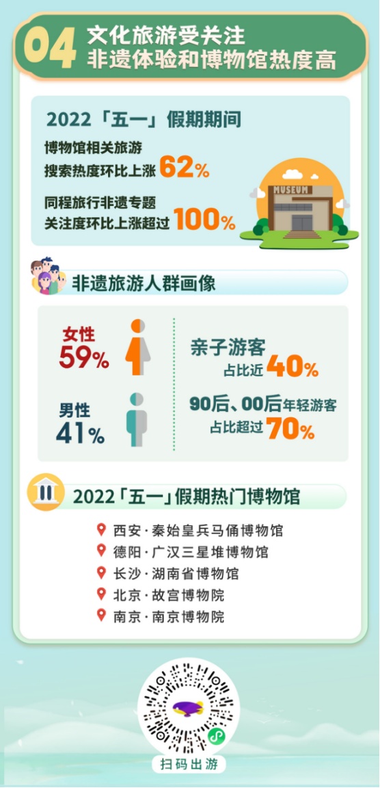 出游半径受限后,游客更加注重出游过程中的文化内涵,博物馆和非遗旅游受到更多游客关注。同程旅行大数据显示,2022年“五一”假期,博物馆相关旅游搜索热度环比上涨62%,同程旅行非遗专题关注度环比上涨超过100%。