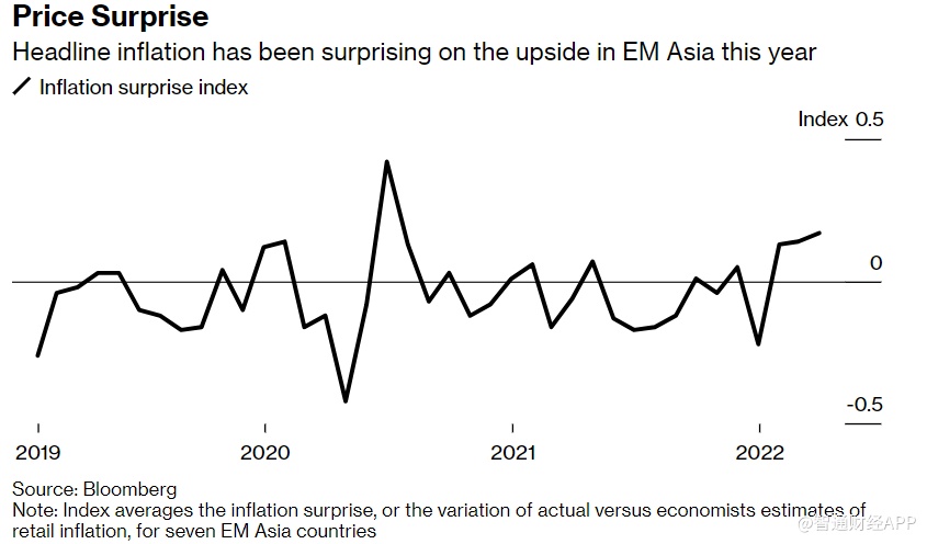 今年亚洲新兴市场的通胀数据强于预期,已使市场预期该地区宽松的央行将采取更强硬的立场。新兴亚洲债券指数今年的跌幅已经超过5%。